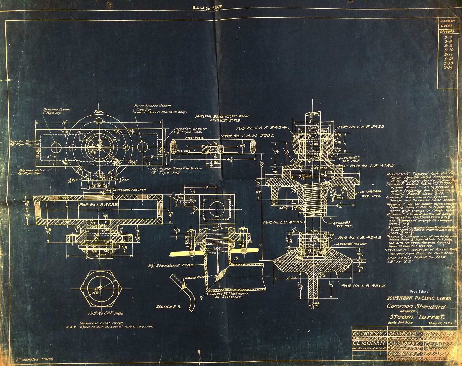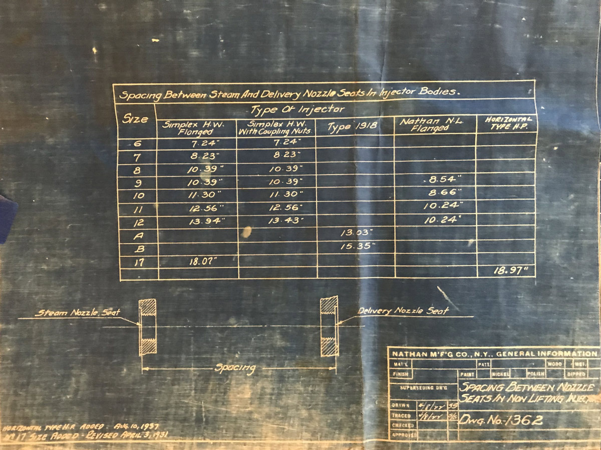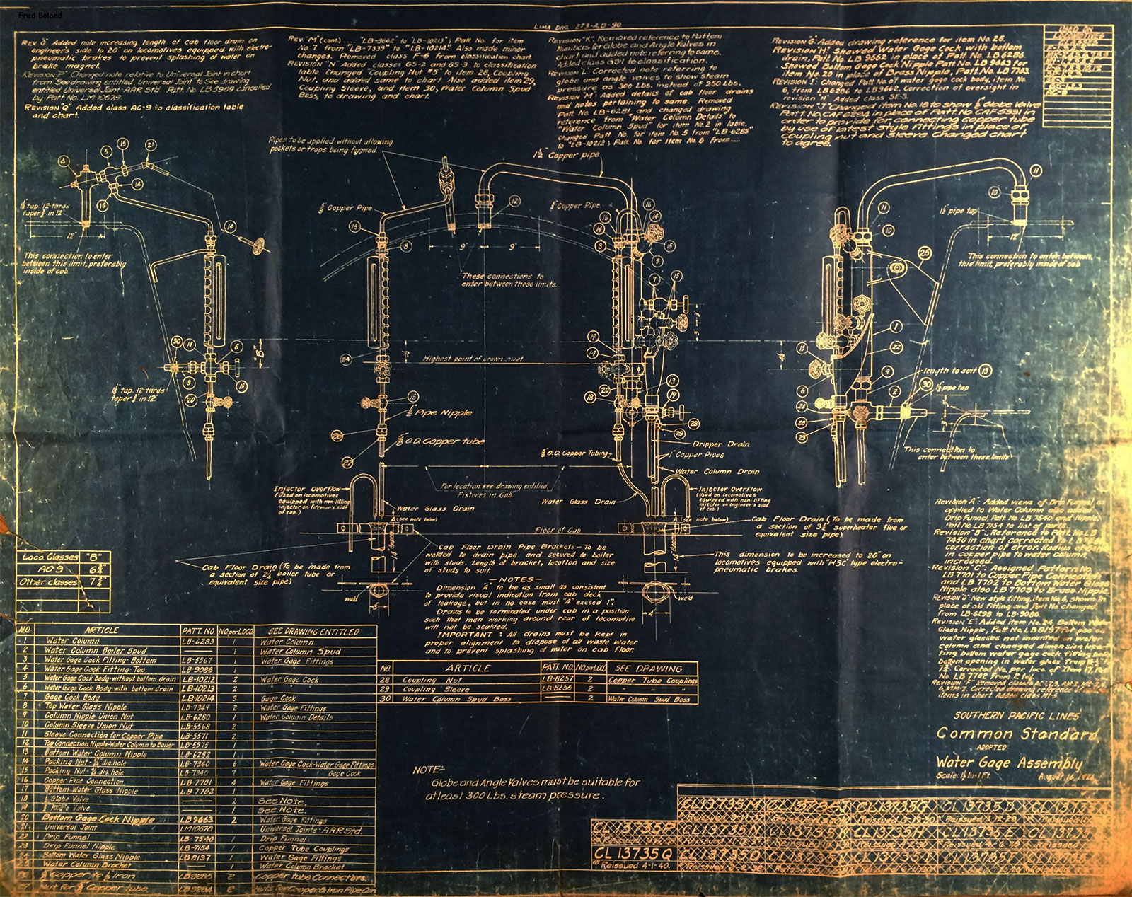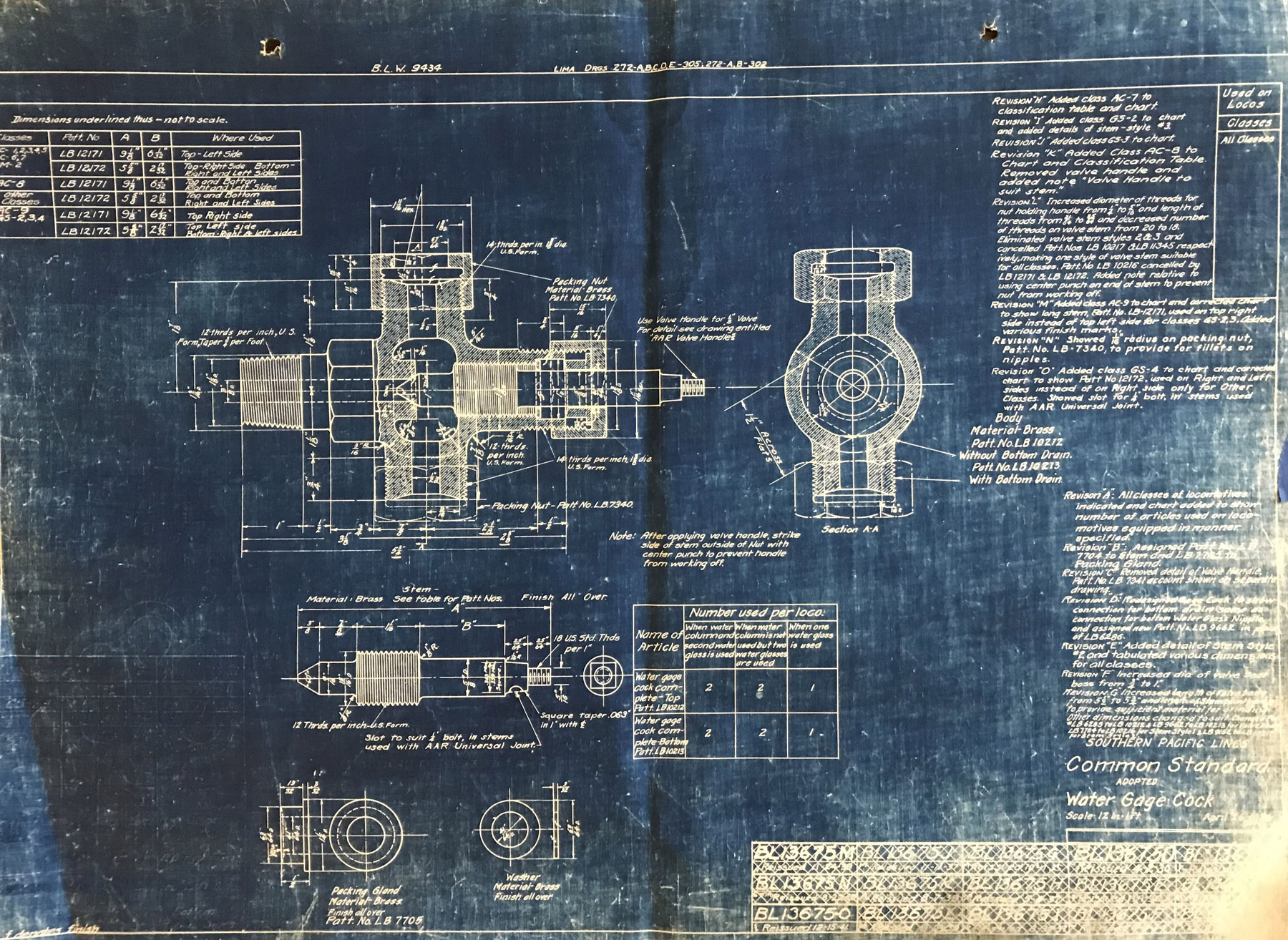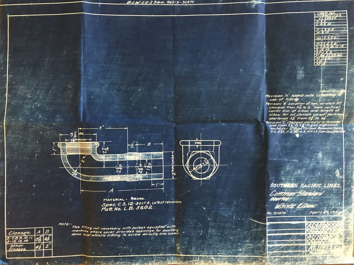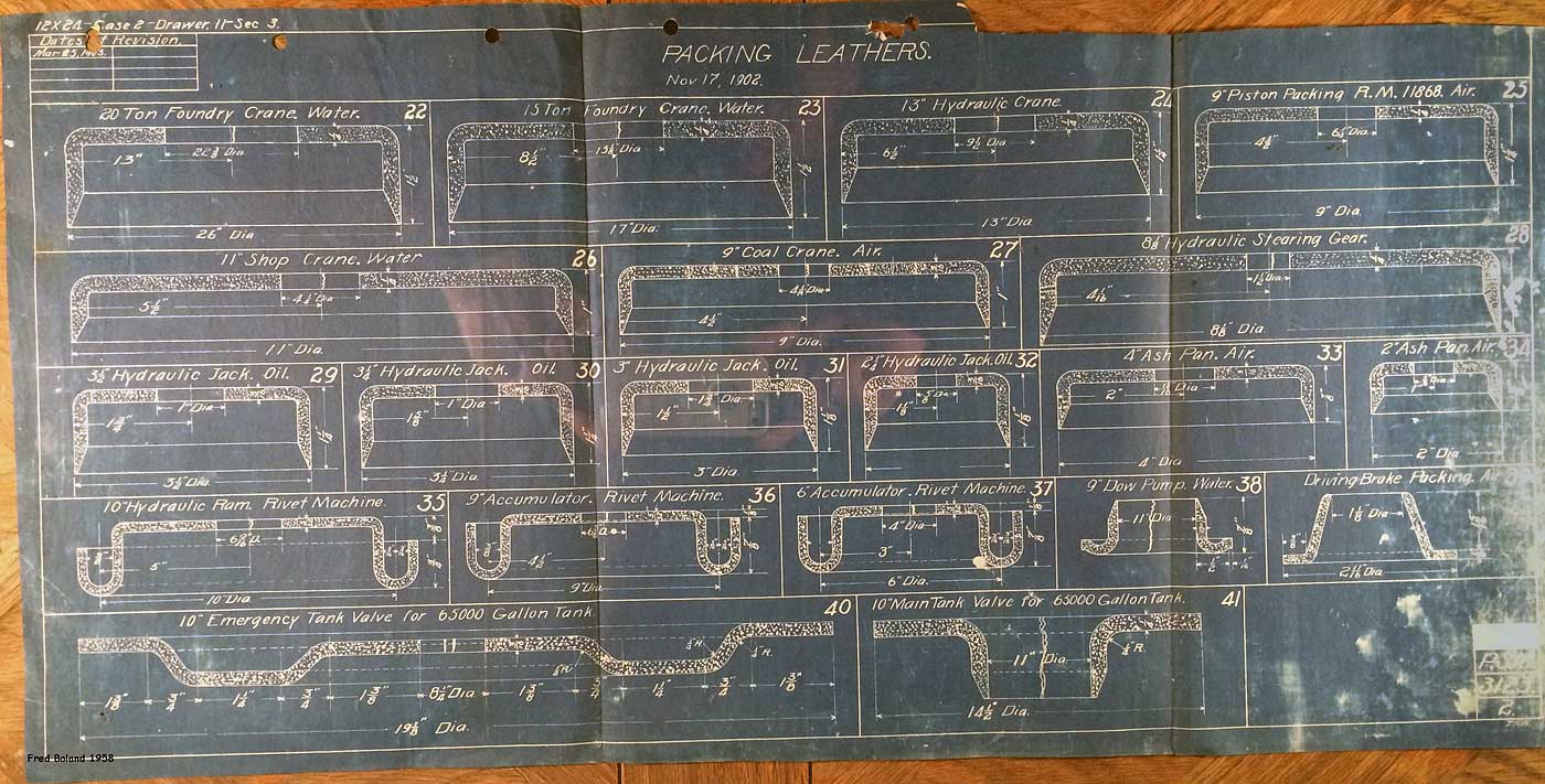 In 1958, after steam was done on Southern Pacific, somebody decided that the volumnuous collection of no-longer-needed steam locomotive drawings filed away at San Francisco's Bayshore Shops could be eliminated. Shop personnel thus began to fill a dumpster with many hundreds of drawings, much to the distress of the late Machinist Fred Boland. By then, Fred had accumulated nearly 40 years of Bayshore service, and these drawings held sentimental value for him, since he had worked with them throughout his long career. But moreover, he recognized their historical significance. Figuring that nobody cared, he began collecting them for preservation. Unfortunately, in that regard he was wrong. When his foreman discovered what Fred was doing, he ordered him to cease his efforts - these were "company secrets" that had to be destroyed, lest they fall into the wrong hands. Never-mind that they were obsolete, and that many of them were essentially those of suppliers that had been redrawn by SP draftsmen to conform to its Common Standard drawings.