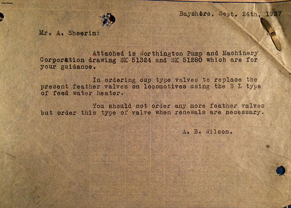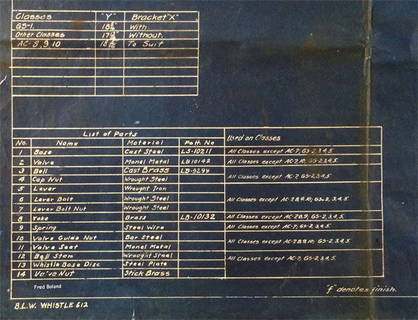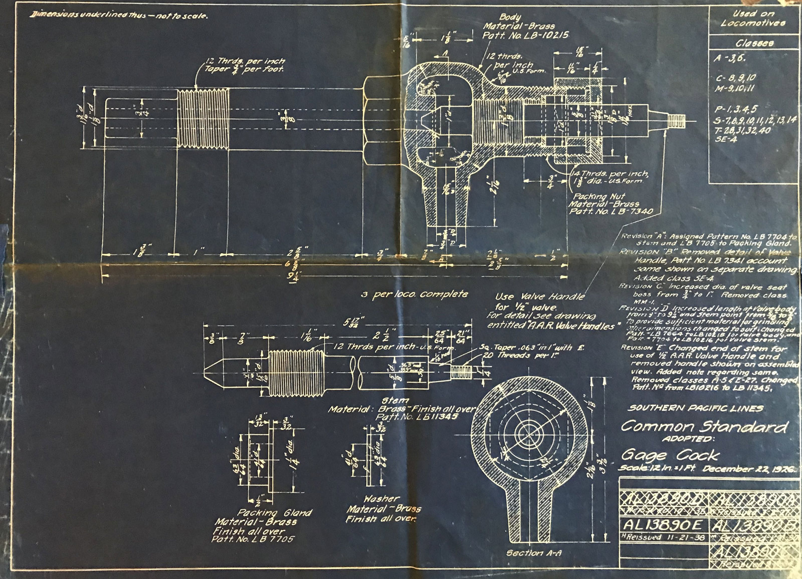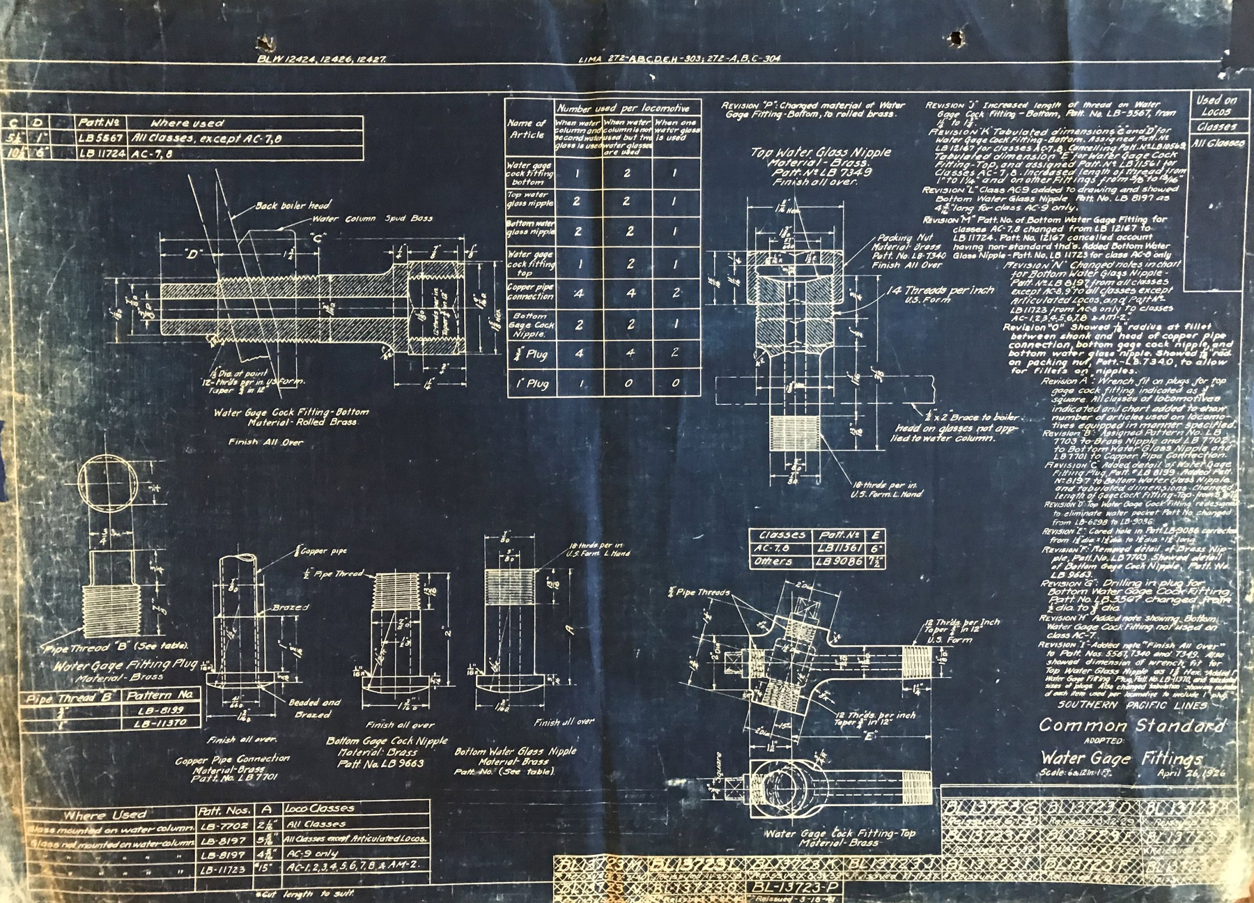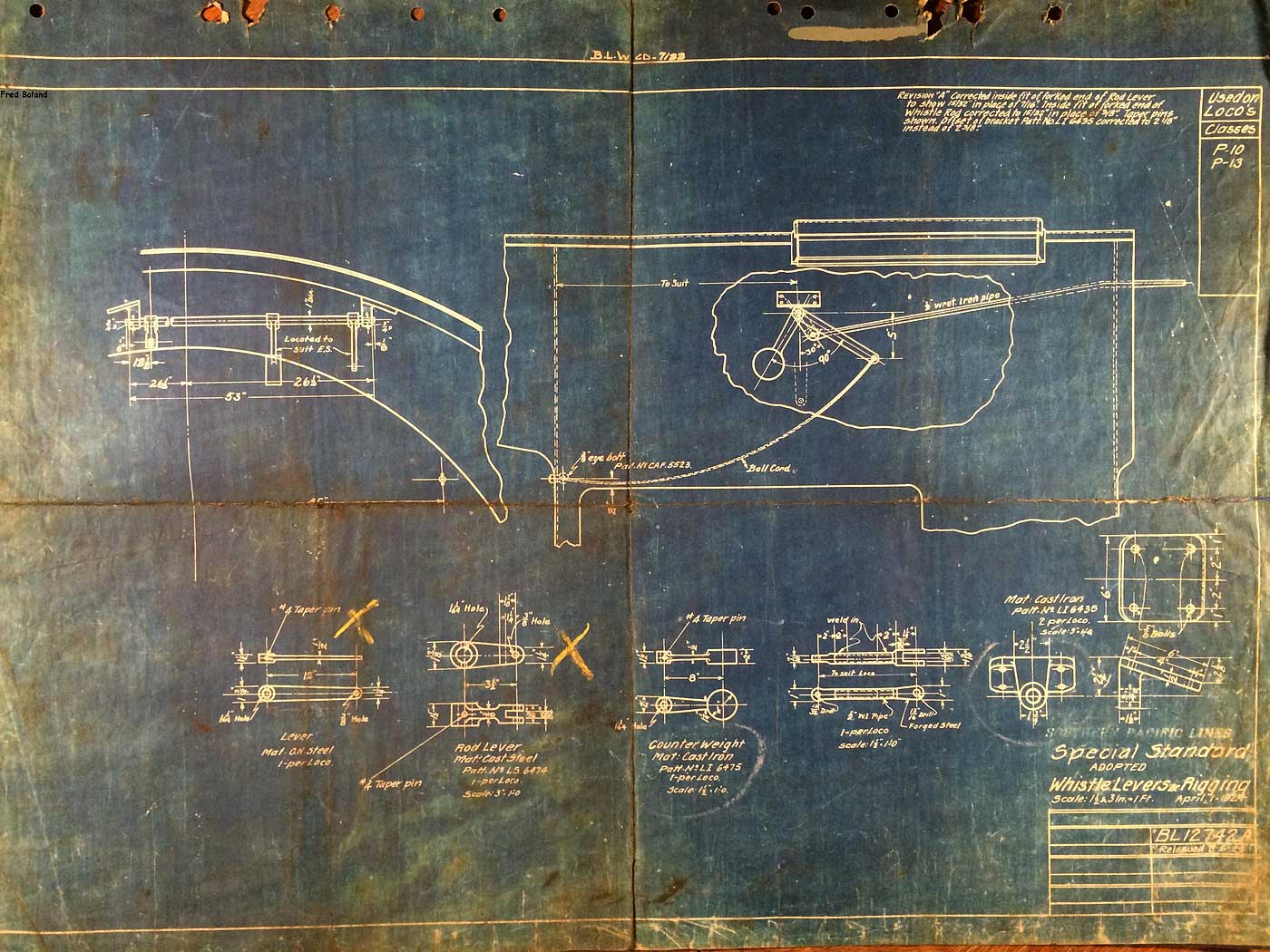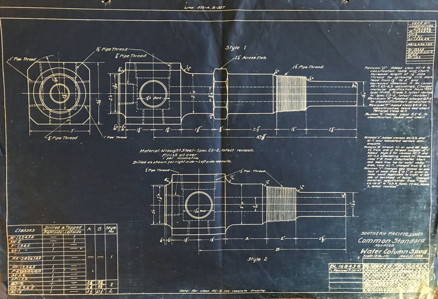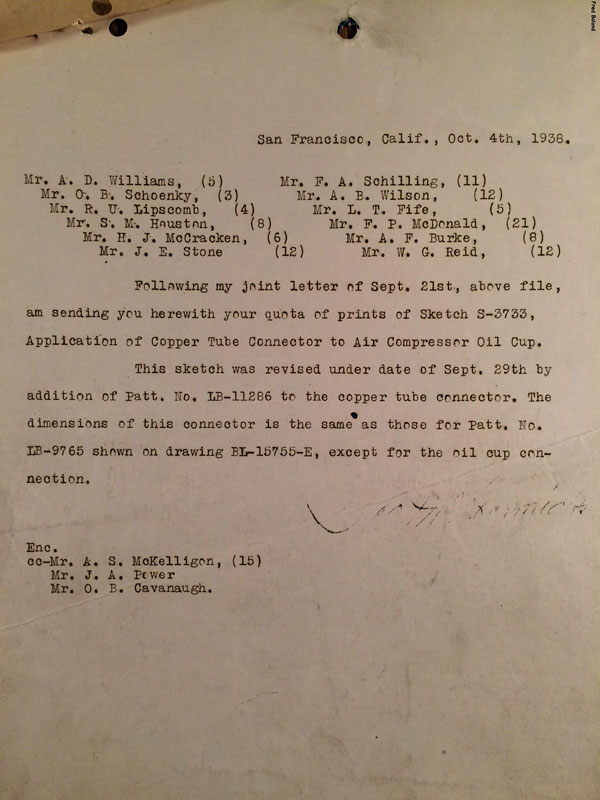 In 1958, after steam was done on Southern Pacific, somebody decided that the volumnuous collection of no-longer-needed steam locomotive drawings filed away at San Francisco's Bayshore Shops could be eliminated. Shop personnel thus began to fill a dumpster with many hundreds of drawings, much to the distress of the late Machinist Fred Boland. By then, Fred had accumulated nearly 40 years of Bayshore service, and these drawings held sentimental value for him, since he had worked with them throughout his long career. But moreover, he recognized their historical significance. Figuring that nobody cared, he began collecting them for preservation. Unfortunately, in that regard he was wrong. When his foreman discovered what Fred was doing, he ordered him to cease his efforts - these were "company secrets" that had to be destroyed, lest they fall into the wrong hands. Never-mind that they were obsolete, and that many of them were essentially those of suppliers that had been redrawn by SP draftsmen to conform to its Common Standard drawings.