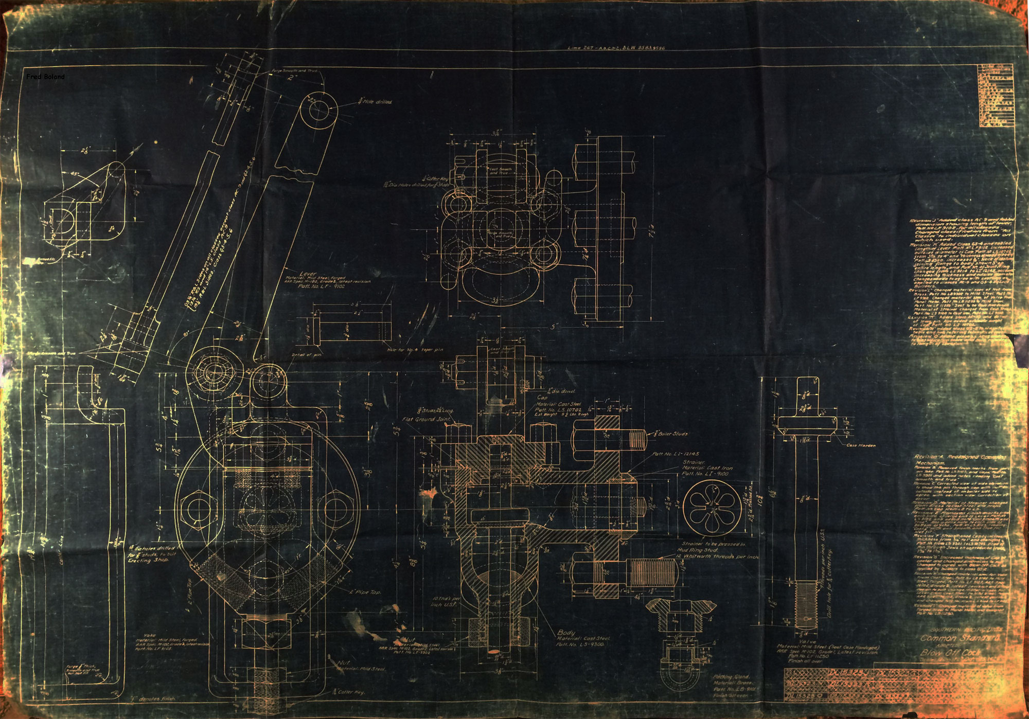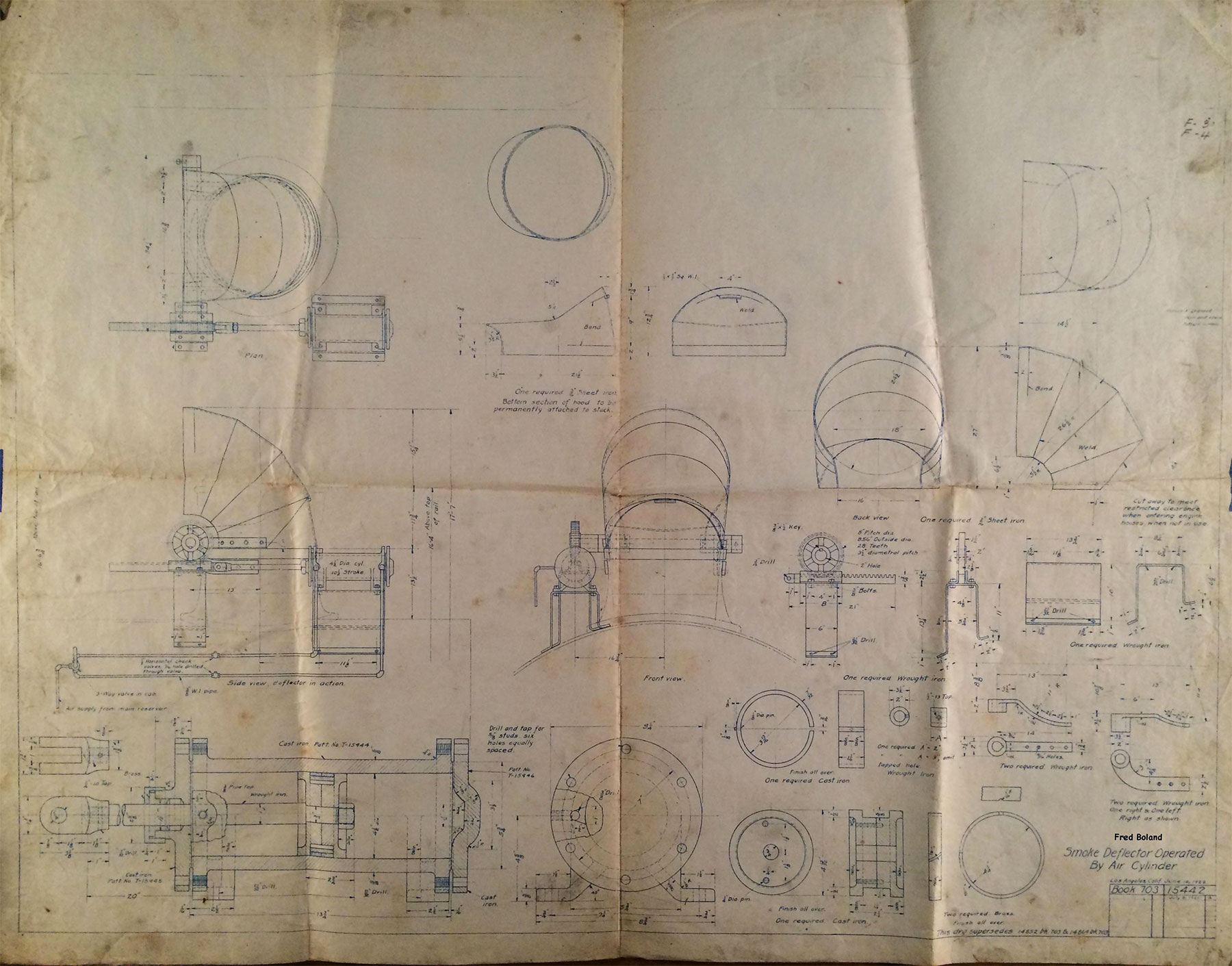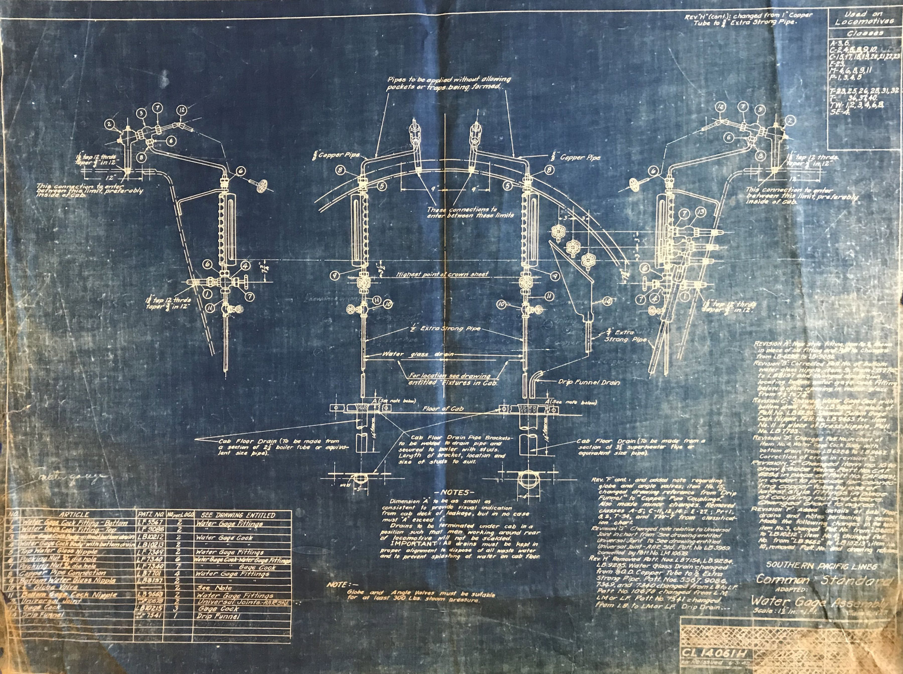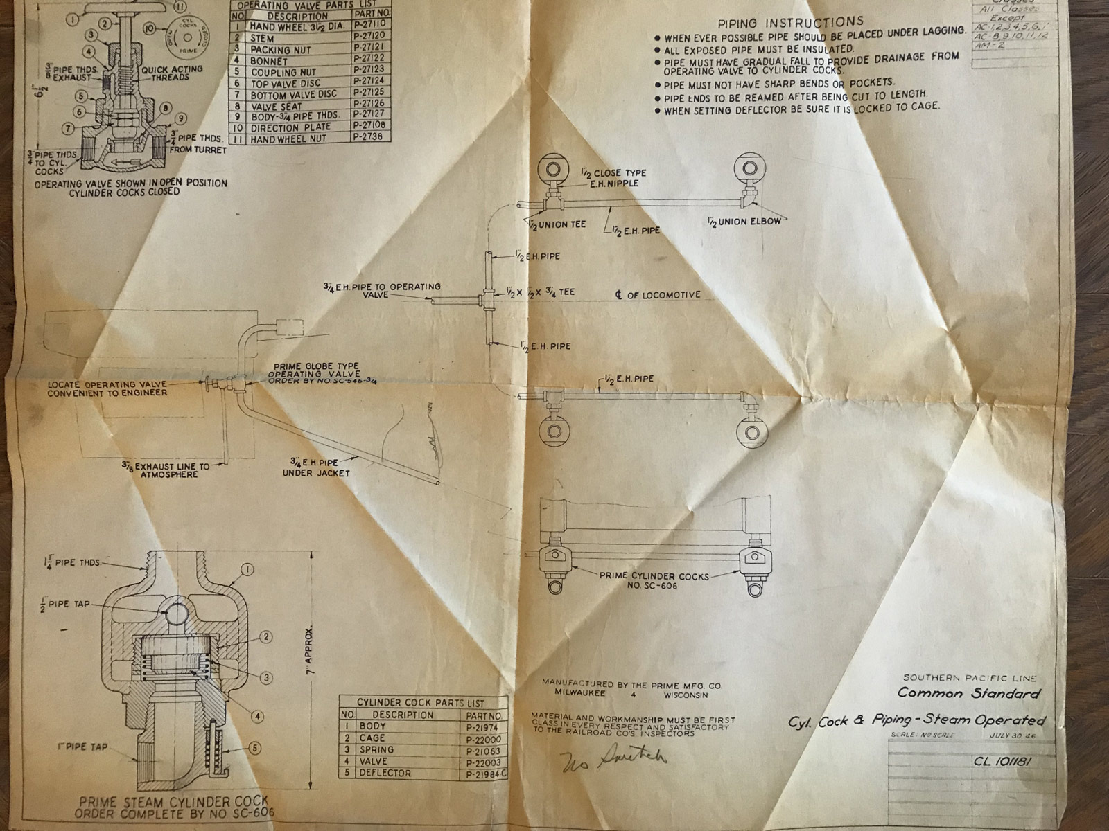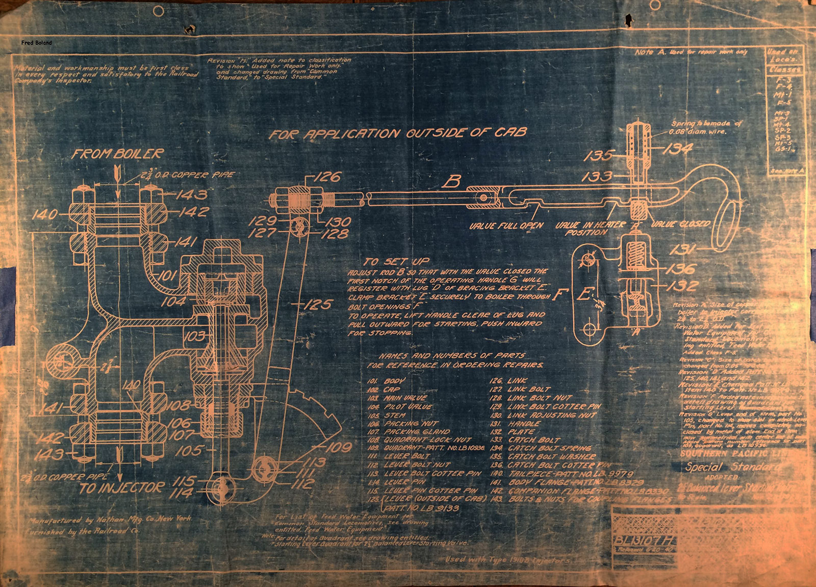 In 1958, after steam was done on Southern Pacific, somebody decided that the volumnuous collection of no-longer-needed steam locomotive drawings filed away at San Francisco's Bayshore Shops could be eliminated. Shop personnel thus began to fill a dumpster with many hundreds of drawings, much to the distress of the late Machinist Fred Boland. By then, Fred had accumulated nearly 40 years of Bayshore service, and these drawings held sentimental value for him, since he had worked with them throughout his long career. But moreover, he recognized their historical significance. Figuring that nobody cared, he began collecting them for preservation. Unfortunately, in that regard he was wrong. When his foreman discovered what Fred was doing, he ordered him to cease his efforts - these were "company secrets" that had to be destroyed, lest they fall into the wrong hands. Never-mind that they were obsolete, and that many of them were essentially those of suppliers that had been redrawn by SP draftsmen to conform to its Common Standard drawings.