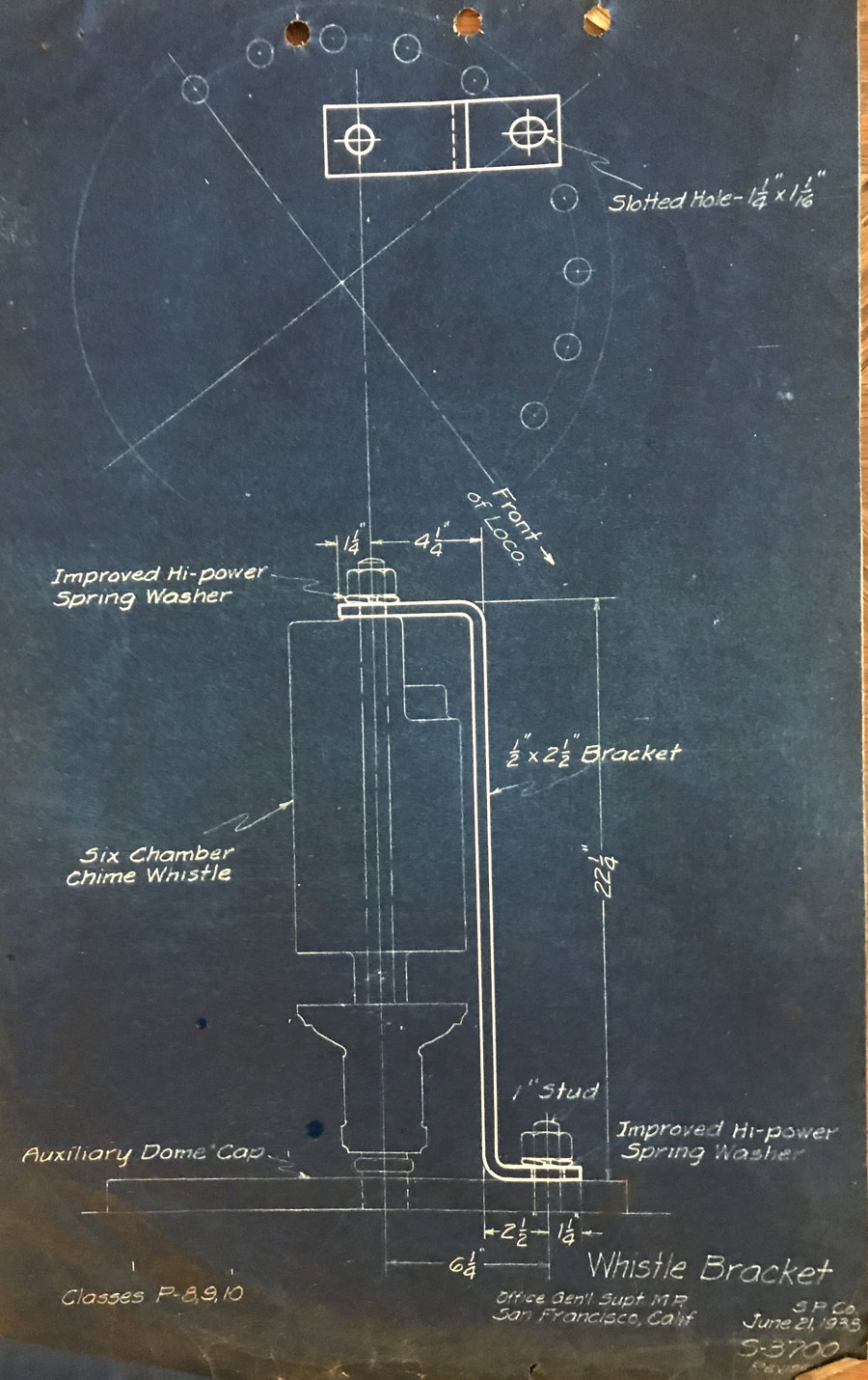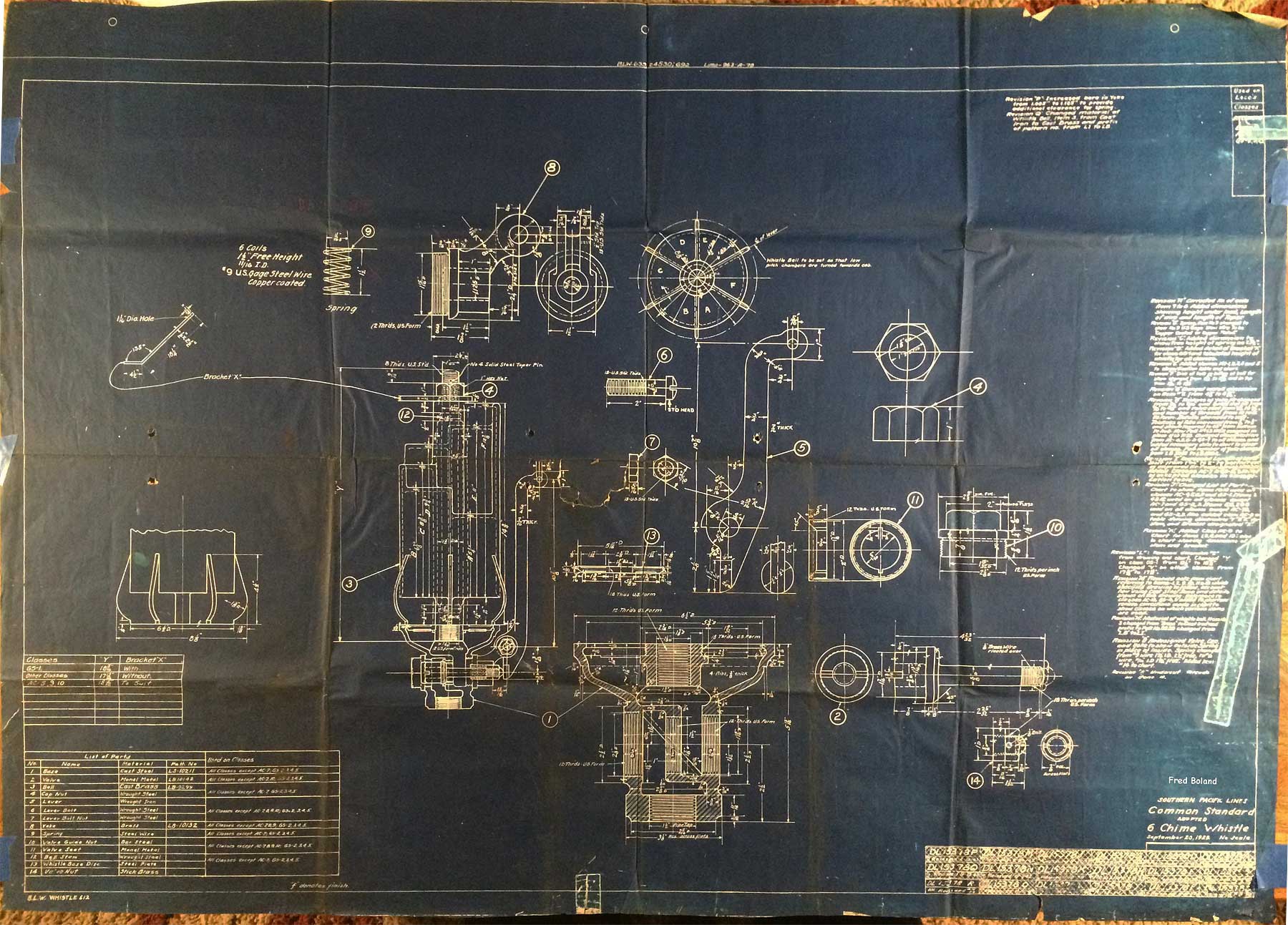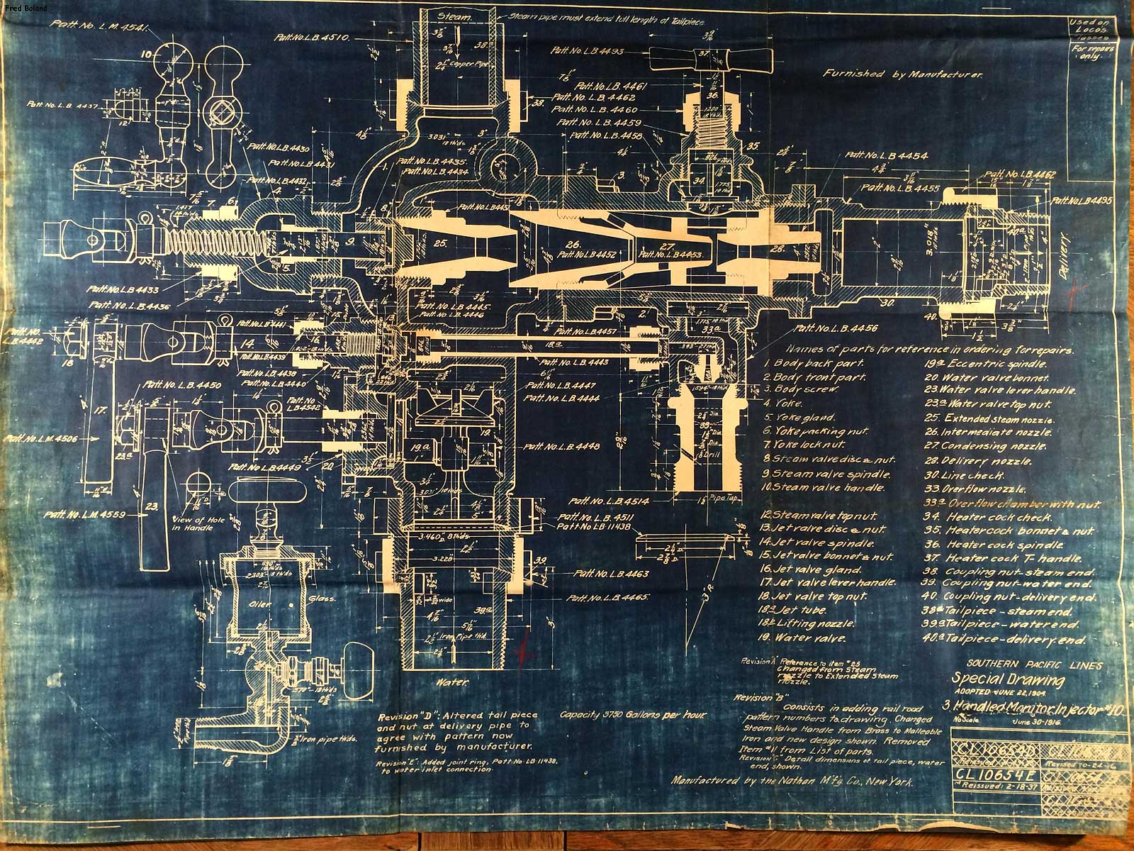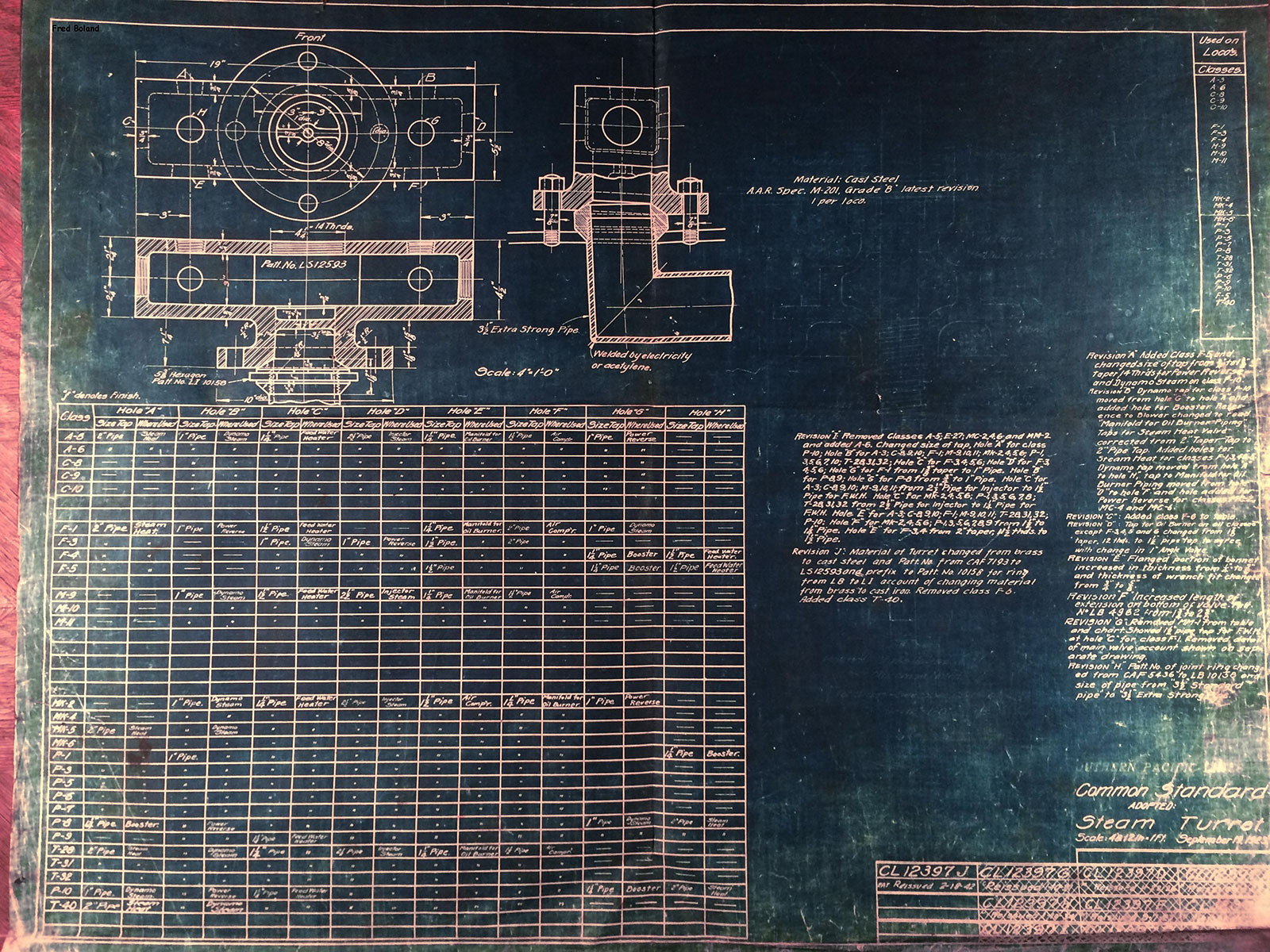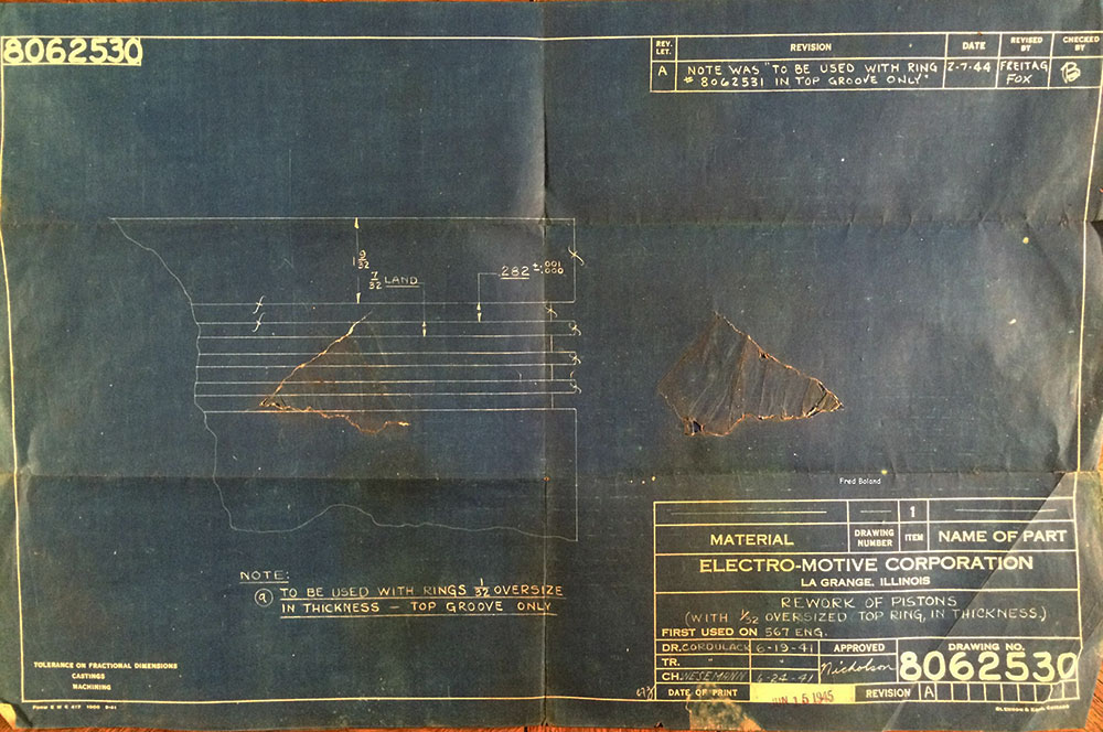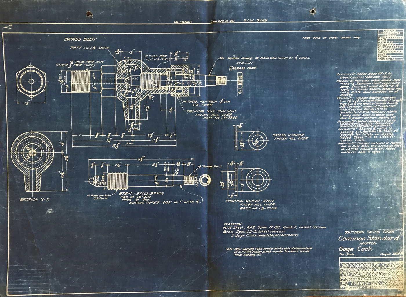 In 1958, after steam was done on Southern Pacific, somebody decided that the volumnuous collection of no-longer-needed steam locomotive drawings filed away at San Francisco's Bayshore Shops could be eliminated. Shop personnel thus began to fill a dumpster with many hundreds of drawings, much to the distress of the late Machinist Fred Boland. By then, Fred had accumulated nearly 40 years of Bayshore service, and these drawings held sentimental value for him, since he had worked with them throughout his long career. But moreover, he recognized their historical significance. Figuring that nobody cared, he began collecting them for preservation. Unfortunately, in that regard he was wrong. When his foreman discovered what Fred was doing, he ordered him to cease his efforts - these were "company secrets" that had to be destroyed, lest they fall into the wrong hands. Never-mind that they were obsolete, and that many of them were essentially those of suppliers that had been redrawn by SP draftsmen to conform to its Common Standard drawings.