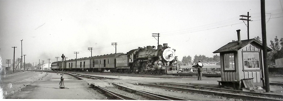 | Afternoon Commute train #153 is interesting in its own right, what with all of those mail/express cars pulled by an air horn equipped P-6 more commonly seen on the Del Monte. But something else caught our eyes; something that will interest maybe three other people. The photo shows the very east end of San Jose Yard at the Newhall Street crossing shanty. Staff hired out as switchmen in San Jose, but had no idea that Newhall St. remained a throughfare over the tracks after the yard appeared in the late 1920's. We kinda remember a paved towpath on the far side of the tracks that led to a switchlocked gate that we passed through on our way to union meetings, so this must be it. Perhaps our memories would be better had beer not been so freely available while addressing union business.